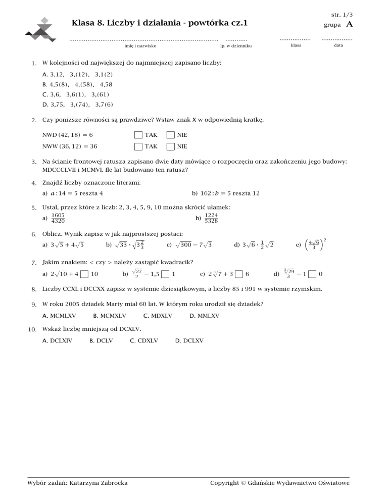 str. 1/3 Klasa 8. Liczby i działania - powtórka cz.1 ................................................................................. imię i nazwisko grupa ............ lp. w dzienniku A ................. ................. klasa data 1. W kolejności od największej do najmniejszej zapisano liczby: A. 3,12, 3,(12), 3,1(2) B. 4,5(8), 4,(58), 4,58 C. 3,6, 3,6(1), 3,(61) D. 3,75, 3,(74), 3,7(6) 2. Czy poniższe równości są prawdziwe? Wstaw znak X w odpowiednią kratkę. NWD (42, 18) = 6 NWW (36, 12) = 36 TAK NIE TAK NIE 3. Na ścianie frontowej ratusza zapisano dwie daty mówiące o rozpoczęciu oraz zakończeniu jego budowy: MDCCCLVII i MCMVI. Ile lat budowano ten ratusz? 4. Znajdź liczby oznaczone literami: a) � : 14 = 5 reszta 4 b) 162 : � = 5 reszta 12 5. Ustal, przez które z liczb: 2, 3, 4, 5, 9, 10 można skrócić ułamek: 1605 1224 a) 4320 b) 5328 6. Oblicz. Wynik zapisz w jak najprostszej postaci: a) 3√5 + 4√5 b) √33 ⋅ √3 3 2 c) √300 − 7√3 7. Jakim znakiem: < czy > należy zastąpić kwadracik? a) 2√10 + 4 10 b) √27 2 − 1,5 1 d) 3√6 ⋅ 2 √2 1 c) 2 √7 + 3 3 6 4√6 2 e) ( 3 ) 3 d) √29 3 −1 0 8. Liczby CCXL i DCCXX zapisz w systemie dziesiątkowym, a liczby 85 i 991 w systemie rzymskim. 9. W roku 2005 dziadek Marty miał 60 lat. W którym roku urodził się dziadek? A. MCMLXV B. MCMXLV C. MDXLV D. MMLXV 10. Wskaż liczbę mniejszą od DCXLV. A. DCLXIV B. DCLV C. CDXLV Wybór zadań: Katarzyna Zabrocka 10099 D. DCLXV Copyright © Gdańskie Wydawnictwo Oświatowe grupa A str. 2/3 11. Oceń prawdziwość zdań. Wstaw znak X w odpowiednią kratkę. Jeżeli w liczbie CMXLV zamienimy miejscami cyfry X i L, to wartość licz- prawda fałsz prawda fałsz prawda fałsz prawda fałsz by zmniejszy się. Liczba zapisana w systemie rzymskim za pomocą 6 cyfr nie może być mniejsza niż liczba zapisana za pomocą 4 cyfr. Liczba, której zapis w systemie rzymskim zaczyna się od cyfry X, nie może być większa od 40. Zapis każdej liczby większej od 70 w systemie rzymskim zaczyna się cyfrą L. 12. Znajdź NWD i NWW liczb: a) 24 i 42 b) 300 i 480 13. Która z podanych liczb jest niewymierna? A. √ 32 B. √4 25 A. − 5 B. 5 8 C. √1 9 1 7 14. Odwrotnością liczby 1 32 jest liczba: 3 3 C. −1 3 2 D. √1,69 D. 1 2 3 15. Liczby całkowite większe od −√6 i mniejsze od √11 to: A. −2, −1, 0, 1, 2, 3 B. −5, −4, −3, −2, −1, 0, 1, 2, 3, 4, 5, 6, 7, 8, 9, 10 C. −2, −1, 0, 1, 2, 3, 4, 5 D. −5, −4, −3, −2, −1, 0, 1, 2 16. Znajdź dwie kolejne liczby całkowite, tak aby jedna z nich była mniejsza, a druga większa od √17. 17. Oceń prawdziwość zdań. Wstaw znak X w odpowiednią kratkę. Liczba 1,2(51) jest większa od 1 14 i mniejsza od 1 21 . Liczba −0,7 jest większa od −1 i mniejsza od − 45 . prawda fałsz prawda fałsz 18. W ramce podane są liczby. Wypisz spośród nich wszystkie te, które są: a) naturalne . . . . . . . . . . . . . . . . . . . . . . . . . . . . . . . . . . . . . . . . . . . . . . . . . . . . . . . . . . . . . . . . . b) całkowite . . . . . . . . . . . . . . . . . . . . . . . . . . . . . . . . . . . . . . . . . . . . . . . . . . . . . . . . . . . . . . . . . c) wymierne . . . . . . . . . . . . . . . . . . . . . . . . . . . . . . . . . . . . . . . . . . . . . . . . . . . . . . . . . . . . . . . . . √10 √−64 −9 3 14 2 √ 25 −3√7 24 6 14 0 9,3 √144 3 19. Oceń prawdziwość zdań. Wstaw znak X w odpowiednią kratkę. Suma liczby i jej odwrotności jest równa 0. prawda fałsz Liczby przeciwne leżą na osi liczbowej w różnej odległości od liczby 0. prawda fałsz prawda fałsz prawda fałsz Odwrotność liczby � różnej od zera to �1 . Istnieje liczba przeciwna do 0. Wybór zadań: Katarzyna Zabrocka 10099 Copyright © Gdańskie Wydawnictwo Oświatowe grupa A str. 3/3 20. Najlżejsza ryba waży 0,00002 dag. Wielkość ta zapisana w notacji wykładniczej ma postać: A. 2 ⋅ 10−5 kg B. 0,2 ⋅ 10−6 kg C. 0,2 ⋅ 106 kg D. 2 ⋅ 105 kg 21. Zapisz podane liczby w notacji wykładniczej. a) 0,06 b) 5 030 000 c) 35 miliardów 22. Zapisz podane liczby bez użycia potęg. b) 8,02 ⋅ 10−6 23. Zapisz bez użycia potęg. c) (− 7 ) a) 2,07 ⋅ 108 a) (1 3 ) 2 2 b) −0,42 Wybór zadań: Katarzyna Zabrocka 10099 5 0 d) (−2 3 ) 1 3 Copyright © Gdańskie Wydawnictwo Oświatowe str. 1/3 Klasa 8. Liczby i działania - powtórka cz.1 ................................................................................. imię i nazwisko grupa ............ lp. w dzienniku B ................. ................. klasa data 1. W kolejności od najmniejszej do największej zapisano liczby: A. 1,3, 1,3(2), 1,33 B. 2,6, 2,56, 2,5(6) C. 4,7, 4,6(7), 4,67 D. 1,(25), 1,2(5), 1,25 2. Czy poniższe równości są prawdziwe? Wstaw znak X w odpowiednią kratkę. NWD (56, 42) = 7 NWW (30, 45) = 15 TAK NIE TAK NIE 3. Na ścianie frontowej ratusza zapisano dwie daty mówiące o rozpoczęciu oraz zakończeniu jego budowy: MDCCCLIII i MCMIV. Ile lat budowano ten ratusz? 4. Znajdź liczby oznaczone literami: a) � : 12 = 5 reszta 9 b) 163 : � = 5 reszta 13 5. Ustal, przez które z liczb: 2, 3, 4, 5, 9, 10 można skrócić ułamek: 1710 5520 a) 2025 b) 6140 6. Oblicz. Wynik zapisz w jak najprostszej postaci: a) 7√5 + 2√5 b) √30 ⋅ √1 5 1 c) √300 − 2√3 7. Jakim znakiem: < czy > należy zastąpić kwadracik? a) 3√17 + 5 17 b) √21 2 − 1,5 1 c) 7 √16 + 2 3 d) 2√6 ⋅ 3 √3 1 16 2 5√6 e) ( 3 ) 3 d) √25 3 −1 0 8. Liczby CCCXX i DCCX zapisz w systemie dziesiątkowym, a liczby 64 i 472 w systemie rzymskim. 9. W roku 2003 dziadek Marty miał 58 lat. W którym roku urodził się dziadek? A. MCMXLV B. MMLXI C. MCMLXV D. MDXLV 10. Wskaż liczbę większą od CDXCIX. A. CDXL B. DLIX C. CDLXX Wybór zadań: Katarzyna Zabrocka 10099 D. CDLX Copyright © Gdańskie Wydawnictwo Oświatowe grupa B str. 2/3 11. Oceń prawdziwość zdań. Wstaw znak X w odpowiednią kratkę. Jeżeli w lic