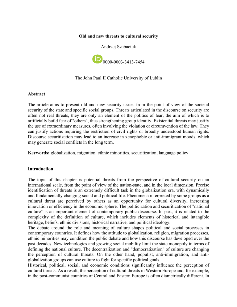 Old and new threats to cultural security Andrzej Szabaciuk 0000-0003-3413-7454 The John Paul II Catholic University of Lublin Abstract The article aims to present old and new security issues from the point of view of the societal security of the state and specific social groups. Threats articulated in the discourse on security are often not real threats, they are only an element of the politics of fear, the aim of which is to artificially build fear of "others", thus strengthening group identity. Existential threats may justify the use of extraordinary measures, often involving the violation or circumvention of the law. They can justify actions requiring the restriction of civil rights or broadly understood human rights. Discourse securitization may lead to an increase in xenophobic or anti-immigrant moods, which may generate social conflicts in the long term. Keywords: globalization, migration, ethnic minorities, securitization, language policy Introduction The topic of this chapter is potential threats from the perspective of cultural security on an international scale, from the point of view of the nation-state, and in the local dimension. Precise identification of threats is an extremely difficult task in the globalization era, with dynamically and fundamentally changing social and political life. Phenomena interpreted by some groups as a cultural threat are perceived by others as an opportunity for cultural diversity, increasing innovation or efficiency in the economic sphere. The politicization and securitization of "national culture" is an important element of contemporary public discourse. In part, it is related to the complexity of the definition of culture, which includes elements of historical and intangible heritage, beliefs, ethnic divisions, historical narrative, and political ideology. The debate around the role and meaning of culture shapes political and social processes in contemporary countries. It defines how the attitude to globalization, religion, migration processes, ethnic minorities may condition the public debate and how this discourse has developed over the past decades. New technologies and growing social mobility limit the state monopoly in terms of defining the national culture. The decentralization and "democratization" of culture are changing the perception of cultural threats. On the other hand, populist, anti-immigration, and antiglobalization groups can use culture to fight for specific political goals. Historical, political, social, and economic conditions significantly influence the perception of cultural threats. As a result, the perception of cultural threats in Western Europe and, for example, in the post-communist countries of Central and Eastern Europe is often diametrically different. In CEE globalization is conducive to social polarization and the intensification of the debate on the issue of cultural threats. Exposing cultural and linguistic differences etc. may serve as a pretext for fostering separatist tendencies (vide Catalonia, Donbas, Scotland), and in extreme cases annexations of the territory of a foreign country (such as Crimea). On the other hand, it may be one of the elements contributing to integration tendencies (vide the European Union, Eurasian Economic Union, etc.). Artificially exposing cultural differences (vide Ukraine, Baltic states), or marginalizing them (vide Belarus), maybe an important instrument of the state's foreign policy, seen as essential for its international security. The politicization and securitization of culture may be linked to the problem of ensuring fundamental human rights and the rights of ethnic minorities. It relates to a debate about a specific model of cultural, immigration, ethnic or educational policy. For this reason, the analysed phenomenon is significant in the context of the changes currently taking place in the international sphere, from the perspective of nation-states and in the regional and local contexts. In the opinion of Barry Buzan, one of the founders of the Copenhagen School of Security Studies, cultural security is an element of broadly understood societal security, which is an element of the five pillars of state security along with military, economic, political, and environmental security (Buzan, 1983: 4–15). Another representative of the Copenhagen School, Ole Waever, proposed a new approach in the analysis of security: the duality of state and societal security. The first focuses on the problem of state sovereignty, the second on the identity of individual social groups. In Waever’s analysis, the rivalry between ethnic and religious groups is of key importance from the point of view of societal security. However, the importance of other groups (ideological, political, sexual, ecological, etc.) cannot be ignored. At the heart of these two key groups is national and religious identity (Wæver et al., 1993: 23–27). The problem of religious and ethnic minorities and the challenges arising from migration processes are the key issues analysed in this chapter. Cultural theories and security studies Culture, and in a particular religion, which is an important component of it, caught the attention of researchers of international relations in the second half of the twentieth century, who often treated it as one of the key factors conditioning and explaining the activities of political entities. These studies date back to the Second World War, when the United States, fascist Germany, and the Soviet Union developed in-depth studies of the culture of hostile countries. After World War II, we observed the development of regional studies in the United States, which introduced the specificity of individual regions and countries, noting the importance of language, broadly understood culture and specific historical experience as elements conditioning development, but also the specificity of the decision-making process. However, the disintegration of the bipolar system and the criticism of t