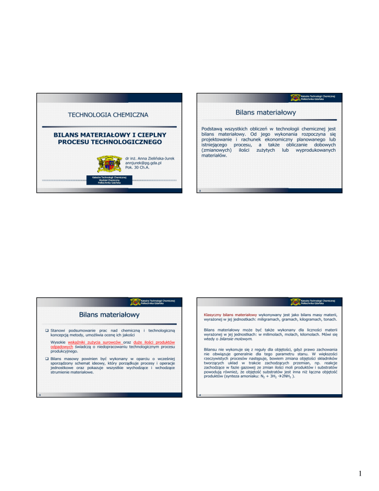 Katedra Technologii Chemicznej Politechnika Gdańska Bilans materiałowy TECHNOLOGIA CHEMICZNA Podstawą wszystkich obliczeń w technologii chemicznej jest bilans materiałowy. Od jego wykonania rozpoczyna się projektowanie i rachunek ekonomiczny planowanego lub istniejącego procesu, a także obliczanie dobowych (zmianowych) ilości zużytych lub wyprodukowanych materiałów. BILANS MATERIAŁOWY I CIEPLNY PROCESU TECHNOLOGICZNEGO dr inż. Anna Zielińska-Jurek [email protected] Pok. 30 Ch.A. Katedra Technologii Chemicznej Wydział Chemiczny Politechnika Gdańska 2 Katedra Technologii Chemicznej Politechnika Gdańska Katedra Technologii Chemicznej Politechnika Gdańska Bilans materiałowy Klasyczny bilans materiałowy wykonywany jest jako bilans masy materii, wyrażonej w jej jednostkach: miligramach, gramach, kilogramach, tonach. Bilans materiałowy może być także wykonany dla liczności materii wyrażonej w jej jednostkach: w milimolach, molach, kilomolach. Mówi się wtedy o bilansie molowym. Stanowi podsumowanie prac nad chemiczną i technologiczną koncepcją metody, umożliwia ocenę ich jakości Wysokie wskaźniki zużycia surowców oraz duże ilości produktów odpadowych świadczą o niedopracowaniu technologicznym procesu produkcyjnego. Bilansu nie wykonuje się z reguły dla objętości, gdyż prawo zachowania nie obwiązuje generalnie dla tego parametru stanu. W większości rzeczywistych procesów następuje, bowiem zmiana objętości składników tworzących układ w trakcie zachodzących przemian, np. reakcje zachodzące w fazie gazowej ze zmian ilości moli produktów i substratów powodują również, że objętość substratów jest inna niż łączna objętość produktów (synteza amoniaku: N2 + 3H2 2NH3 ). Bilans masowy powinien być wykonany w oparciu o wcześniej sporządzony schemat ideowy, który porządkuje procesy i operacje jednostkowe oraz pokazuje wszystkie wychodzące i wchodzące strumienie materiałowe. 3 4 1 Katedra Technologii Chemicznej Politechnika Gdańska Katedra Technologii Chemicznej Politechnika Gdańska Typy bilansów masowych Typy bilansów masowych Można wykonywać zarówno bilans całkowity procesu (układu), bilans jednego ze składników (związków chemicznych), bilanse wszystkich składników lub bilans pierwiastków (molowy lub masowy) biorących udział w procesie. Obowiązuje tu żelazna zasada: 1. Bilans strumieniowy Polega na określeniu wielkości strumieni masowych bez podawania ich składu chemicznego. Sporządzany w celu określenia: globalnych przepływów Suma bilansów wykonanych dla wszystkich składników (pierwiastków) stanowi bilans całkowity procesu lub układu. 5 doboru wielkości aparatów procesowych oraz gdy określenie składu oraz bilansowanie poszczególnych składników jest niemożliwe z powodu braku wystarczających danych 6 Katedra Technologii Chemicznej Politechnika Gdańska Katedra Technologii Chemicznej Politechnika Gdańska Typy bilansów masowych Typy bilansów masowych 3. 2. Bilans składnikowy pełny Gdy dysponujemy wynikami analiz niektórych składników głównych strumieni, wówczas obok bilansu strumieniowego można sporządzić bilans jednego lub kilku składników szczególnie istotnych dla danego procesu. Polega na określeniu wielkości strumieni masowych oraz podaniu ich składu i bilansowaniu poszczególnych składników Opracowywany dla dobrze zbadanych procesów, dla wielkotonażowych instalacji przemysłowych tj. rafinerie ropy naftowej, gdzie składy poszczególnych strumieni mają zasadnicze znaczenie dla procesu technologicznego, jak i dla ekonomiki. 7 Bilans składnikowy cząstkowy 8 2 Dogodną formą przedstawiania bilansu są wykresy strumieniowe (wykresy Sankeya) Bilans materiałowy dla procesu wytwarzania fosforu z rudy apatytowej w piecu elektrycznym Przychód [kg] Rozchód [kg] Ruda apatytowa 10250 Fosfor 1000 Piasek 2370 Żelazofosfor 282 Koks 1330 CO 3668 Szlaka 9000 Bilans materiałowy 13950 13950 Katedra Technologii Chemicznej Politechnika Gdańska Katedra Technologii Chemicznej Politechnika Gdańska Bilans materiałowy Podstawą do sporządzania każdego bilansu jest prawo zachowania masy, które mówi, że masa surowców wprowadzona do procesu technologicznego musi być równa masie substancji otrzymanych w wyniku dokonanych przemian: We wszystkich jednostkach procesowych bez względu na ich złożoność obowiązują: zasada zachowania masy (z wyjątkiem reakcji jądrowych) Gisur = Giprod zasada zachowania atomów (w reakcjach chemicznych) Uwzględniając udziały masowe poszczególnych składników otrzymuje się następujące zależności: zasada zachowania energii dla procesów jednostkowych (niMi)sub = (niMi)prod dla operacji jednostkowych (wiGi)sub = (wiGi)prod 11 12 3 Katedra Technologii Chemicznej Politechnika Gdańska Katedra Technologii Chemicznej Politechnika Gdańska Większość procesów chemicznych zalicza się do okresowych lub ciągłych. Procesy okresowe są bardziej ekonomiczne, gdy produkty wytwarza się w małej ilości (np. w przemyśle farmaceutycznym lub kosmetycznym), natomiast w produkcji wielkotonażowej mamy prawie wyłącznie do czynienia z procesami ciągłymi. Prawo zachowania masy przy bilansowaniu materiałowym jednostki procesowej można sformułować następująco: Bilans materiałowy [masowe natężenie przepływu strumieni dopływających] - [masowe natężenie przepływu strumieni odpływających] = [szybkość akumulacji wewnątrz aparatu] ∑m i( substratów ) i 13 =∑ mi( produktów ) i 14 Katedra Technologii Chemicznej Politechnika Gdańska Katedra Technologii Chemicznej Politechnika Gdańska Bilans materiałowy Bilans materiałowy Proces ciągły przebiegający tak, że człon odpowiadający akumulacji jest równy zeru lub tak mały, że można go pominąć, nazywa się procesem przebiegającym w stanie ustalonym. Dla takiego procesu bilans materiałowy sprowadza się do prostszej postaci: Większość strumieni procesowych 