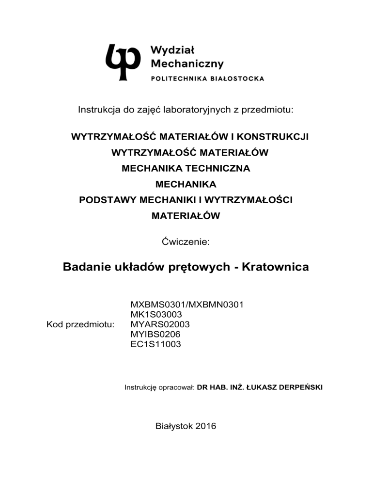 Instrukcja do zajęć laboratoryjnych z przedmiotu: WYTRZYMAŁOŚĆ MATERIAŁÓW I KONSTRUKCJI WYTRZYMAŁOŚĆ MATERIAŁÓW MECHANIKA TECHNICZNA MECHANIKA PODSTAWY MECHANIKI I WYTRZYMAŁOŚCI MATERIAŁÓW Ćwiczenie: Badanie układów prętowych - Kratownica Kod przedmiotu: MXBMS0301/MXBMN0301 MK1S03003 MYARS02003 MYIBS0206 EC1S11003 Instrukcję opracował: DR HAB. INŻ. ŁUKASZ DERPEŃSKI Białystok 2016 CEL ĆWICZENIA Celem ćwiczenia jest doświadczalne wyznaczenie sił osiowych w prętach kratownicy płaskiej przy zadanym obciążeniu zewnętrznym. Otrzymane z eksperymentu wartości sił należy porównać z siłami wyznaczonymi analitycznie za pomocą znanych z mechaniki metod. 1. Opis stanowiska Stanowisko do badań sił osiowych w prętach kratownicy płaskiej przedstawiono na poniższym schemacie (rys. 1). 11 Rys.1. Stanowisko do badań sił osiowych w zadanym układzie prętowym W skład stanowiska (rys. 1) wchodzą następujące elementy: Oznaczenie na rysunku 1 2 3 4 5 6 7 8 9 10 11 Opis Pręt długości L 300mm Pręt długości L1 L 2 424mm Pręt nastawny o zmiennej długości L2 400 450mm Podpora z dyskiem węzłowym Dysk węzłowy Mechanizm obciążający zmienną siłą 0 ÷ 500N z pierścieniowym dynamometrem i oprawką Czujnik zegarowy do pomiaru przemieszczenia w zakresie 0÷20mm Uchwyt czujnika zegarowego Kabel łączący Urządzenie pomiarowe Rama nośna stanowiska Liczba elementów 5 2 1 2 3 1 1 1 8 1 1 2 2. Przygotowanie stanowiska i pomiar sił w prętach Montaż stanowiska pomiarowego należy wykonać według następującej procedury: 1. zamontować podpory wraz z dyskiem węzłowym w ramie według poniższego schematu: 4 4 11 1. Rys. 2. Podpory z dyskiem węzłowym w ramie 2. przygotować konfigurację kratownicy na stole laboratoryjnym jak na schemacie poniżej Potrzebne elementy: 4 x element 1 ( L 300mm ) 2 x element 2 ( L1 424mm ) 1 x element 3 3 x dysk węzłowy 5 2. Rys. 3. Złożona kratownica UWAGA: Długości poszczególnych części są liczone pomiędzy centralnymi punktami dysku węzłowego. Rzeczywiste długości prętów są o 60 mm krótsze., Oś geometryczna każdego łączonego pręta musi przechodzić przez środek dysku węzłowego (rys. 4.) 3 W celu skonstruowania stabilnej kratownicy, jeden pręt w każdym dysku węzłowym musi być zabezpieczony dodatkowym kołkiem blokującym (Rys. 5) Rys.5 3. zamontować kratownicę w ramie i podłączyć mechanizm obciążający jak na schemacie poniżej (rys. 6) UWAGA: Mechanizm obciążający należy dokładnie prostopadle ustawić względem kratownicy. Nieprawidłowe ustawienie spowoduje znaczne różnice w wartościach sił mierzonych i obliczonych analitycznie. Rys. 6. Kratownica zamontowana w ramie Siła z mechanizmu obciążania jest odczytywana z wskazań dynamometru, gdzie: 1 podziałka → 1/100 mm → 10N 4. przygotować i podłączyć urządzenie pomiarowe (FL 151) Urządzenie pomiarowe zaprojektowano w celu odczytywania wartości z czujników tensometrycznych, umieszczonych na każdym z prętów. Jest ono wyposażone w panel LCD (1), na którym bezpośrednio odczytywana jest wartość siły działającej w poszczególnym pręcie. Posiada ono 16 gniazd wejściowych (3). Testowane pręty kratownicy są połączone z urządzeniem pomiarowym za pomocą przewodów (2). Pod panelem LCD znajdują się 4 przyciski: ▲▼– służą do wyboru kanału, z którego ma być aktualnie wyświetlana zmierzona wartość siły w pręcie. TARE – zeruje wartość siły w wszystkich kanałach Rys. 7. Urządzenie pomiarowe z przewodem łączącym SHIFT + TARE – wybiera pożądany bank 4 3. Wyznaczenie sił w prętach metodą analityczną W rozpatrywanym przykładzie doświadczalnym poszczególne siły w prętach zostaną obliczone i porównane z wartościami sił wewnętrznych zmierzonymi w eksperymencie. Do obliczeń wykorzystano schemat kratownicy przedstawiony poniżej. Pominięto pręt nastawczy (7), a dolną podporę potraktowano jako przesuwną (rys. 8). a) b) Rys.8. a)Schemat obliczeniowy, b) Numeracja węzłów, prętów oraz sił i reakcji Siły w prętach wyznaczono metodą analitycznego równoważenia węzłów oraz metodą Rittera. Siły w prętach przyjęto jako rozciągające. Węzeł I: F 0 F S sin 45 v 1 1 S1 2 F 1.41F F 0 S S cos 45 H 2 1 2 S2 F Węzeł II: F 0 S S sin 45 v 3 1 3 S3 F F 0 S S cos 45 H 4 1 4 S4 F 5 Pozostałe wartości sił osiowych wyznaczono za pomocą metody Rittera: M 0 S L F 2L A 5 6 S6 2 F M 0 S L S cos 45 L 6 II 6 5 S5 2 F 1.41F Tab. 1. Zestawienie wartości sił osiowych w prętach kratownicy przy obciążeniu siłą F Nr pręta 1 2 3 4 5 6 Siła [N] 1.41F -F -F F 1.41F -2F 4. Przebieg części doświadczalnej Przy wykonywaniu pomiarów należy wykonać następujące czynności: 1. Podłączyć urządzenie pomiarowe za pomocą przewodów do czujników pomiarowych znajdujących się na prętach. 2. Odciążyć kratownicę. Mechanizm obciążania musi być luźny. 3. Wyzerować wskaźnik dynamometru. 4. Poluzować śrubę zaciskową na elemencie 3. 5. Wyzerować wszystkie kanały w urządzeniu pomiarowym. 6. Sprawdź wskazania kanałów pomiarowych. Wskazania powinno mieścić się w zakresie 0 ± 10N. 7. Zabezpieczyć element 3 poprzez dokręcenie śruby zaciskowej. Kratownica jest teraz „niewyznaczalna”. 8. Kiedy napięcie w kratownicy jest zwolnione, dynamometr musi ponownie wskazać zero. 9. Obciążyć kratownicę siłą 200N (20 podziałek na dynamometrze). 10. Odczytać i zapisać wartości sił jakie występują w prętach „niewyznaczalnej” kratownicy. 11. Poluzować śrubę zaciskową na elemencie 3. Kratownica jest teraz „wyznaczalna”. 12. Zwalniać napięcie w kratownicy, aż do momentu gdy dynamometr ponownie wskaże zero. 13. Wyzerować wszystkie kanały w urządzeniu pomiarowym. 14. Obciążyć kratownicę siłą 200N (20 podziałek na dynamometrze). 15. Odczytać i zapisać wartości sił jakie występują w prętach wyznaczalnej kratownicy. UW