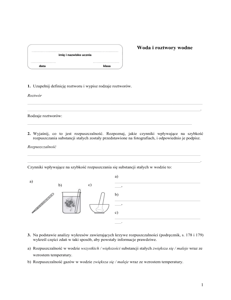Woda i roztwory wodne 1. Uzupełnij definicję roztworu i wypisz rodzaje roztworów. Roztwór __________________________________________________________________________________ _________________________________________________________________________________. Rodzaje roztworów: _____________________________________________________________________________ 2. Wyjaśnij, co to jest rozpuszczalność. Rozpoznaj, jakie czynniki wpływające na szybkość rozpuszczania substancji stałych zostały przedstawione na fotografiach, i odpowiednio je podpisz. Rozpuszczalność _________________________________________________________________________________ _________________________________________________________________________________. Czynniki wpływające na szybkość rozpuszczania się substancji stałych w wodzie to: a) b) c) a) ________________________________________ ___, b) ________________________________________ ___, c) ________________________________________ ___. 3. Na podstawie analizy wykresów zawierających krzywe rozpuszczalności (podręcznik, s. 178 i 179) wykreśl części zdań w taki sposób, aby powstały informacje prawdziwe. a) Rozpuszczalność w wodzie wszystkich / większości substancji stałych zwiększa się / maleje wraz ze wzrostem temperatury. b) Rozpuszczalność gazów w wodzie zwiększa się / maleje wraz ze wzrostem temperatury. 1 4. Przeanalizuj schemat doświadczenia chemicznego, korzystając z krzywej rozpuszczalności chlorku sodu NaCl (podręcznik, s. 178). Odpowiedz na pytania. Jaka jest rozpuszczalność chlorku sodu w temperaturze 20ºC? _______________ Jakie jest stężenie procentowe otrzymanego roztworu? ________________ 5. Uczeń przygotował 600 g roztwóru 10-procentowego chlorku sodu NaCl. Następnie ten roztwór odparował do sucha. Oblicz masę substancji pozostałej po odparowaniu. 2