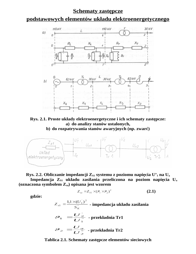 Schematy zastępcze podstawowych elementów układu elektroenergetycznego Rys. 2.1. Proste układy elektroenergetyczne i ich schematy zastępcze: a) do analizy stanów ustalonych, b) do rozpatrywania stanów awaryjnych (np. zwarć) Rys. 2.2. Obliczanie impedancji ZS1 systemu z poziomu napięcia U’1 na Ua Impedancja ZS1 układu zasilania przeliczona na poziom napięcia U a (oznaczona symbolem Zsa) opisana jest wzorem (2.1) gdzie: - impedancja układu zasilania - przekładnia Tr1 - przekładnia Tr2 Tablica 2.1. Schematy zastępcze elementów sieciowych Tablica 2.2. Rezystancja jednostkowa przewodów z miedzi, aluminium, stopu aluminium, stalowo-aluminiowych i z brązu Rys. 2.3. Układy przewodów wiązkowych o wiązce dwu- i czteroprzewodowej Rys. 2.4. Przeplatanie przewodów linii Tablica 2.3. Przybliżone wartości podstawowych parametrów jednostkowych napowietrznych linii elektroenergetycznych Rys. 2.5. Przykłady układów przewodów symetrycznych (a) i niesymetrycznych (b, c) pod względem pojemnościowym Uwaga - wszystkie obliczane parametry należy odnieść dla wybranego do obliczeń poziomu napięcia znamionowego. Transformator dwuuzwojeniowy Rezystancję RT uzwojeń Tr oblicza się ze wzoru (2.21) gdzie: PCu%, PCu UN SN - straty mocy w uzwojeniach [%, kW], - napięcie znamionowe uzwojenia dla którego przeprowadza się obliczenia [kV], - moc znamionowa transformatora [MVA]. Reaktancję XT Tr w zależności od mocy oblicza się z jednego z dwóch poniżej podanych wzorów: a) gdy SN 2,5 MVA (2.22) gdzie: - impedancja uzwojeń Tr, UZ% - procentowe napięcie zwarcia [%]. b) jeżeli SN > 2,5 MVA (2.23) Konduktancje GT Tr wyznaczamy ze wzoru (2.24) gdzie: PFe%, PFe - straty w żelazie [%, kW]. Suscseptancję BT wyznaczamy z zależności (2.24) gdzie: I% - prąd magnesowania Tr [%] lub (2.25) gdzie: YT - admitancja uzwojeń Tr obliczona ze wzoru Io% - prąd biegu jałowego [%]. (dla dużych Tr można przyjąć, że ) Transformator trójuzwojeniowy Impedancje podłużne oblicza się dla poszczególnych par uzwojeń, tj. 1-2, 2-3, 1-3. Rezystancję par uzwojeń oblicza się ze wzorów (podobnych jak dla TR dwuuzwojeniowego) (2.27) natomiast reaktancję poszczególnych par uzwojeń (ponieważ zwykle SN > 2,5 MVA) z zależności (2.28) Podane we wzorach (2.27), (2.28) wartości UN i SN odnosi się do największego zasilającego uzwojenia. Znając impedancję par uzwojeń (2.29) wyznacza się impedancje poszczególnych uzwojeń Tr ze wzorów (2.30) Uwaga: ww. impedancje mogą przyjmować wartości ujemne. Admitancję oblicza się dwuuzwojeniowego (tj. ze wzorów (2.24 - 2.26)). podobnie jak dla Tr Autotransformator Dla autotransformatorów dwuuzwojeniowych stosuje się podobne wzory jak dla Tr dwuuzwojeniowego z tą różnicą, że zamiast mocy S N wstawia się moc przechodnią SP autotransformatora wyznaczoną z zależności (2.31) gdzie: SW - moc własna autotransformatora, 12 - przekładnia autotransformatora. W przypadku braku danych katalogowych autotransformatora, jego parametry autotransformatora wyznacza się w sposób przybliżony korzystając z danych Tr dwuuzwojeniowego o takiej samej mocy znamionowej S N, równej mocy przechodniej Sp, o tym samym napięciu górnym. Korzysta się wówczas z następujących zależności (2.32) We wzorze (2.32) oznaczenie (a) dotyczy danych autotransformatora. Dławik przeciwzwarciowy W dławikach uwzględnia się tylko reaktancję indukcyjną XD obliczoną ze wzoru (2.33) gdzie: UZ% - procentowe napięcie zwarcia dławika [%], UN - napięcie znamionowe [kV], SN - moc znamionowa [MVA], IN - prąd znamionowy [A].