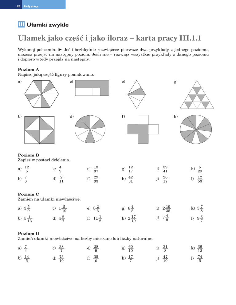 12 Karty pracy III Ułamki zwykłe Ułamek jako cz´Êç i jako iloraz – karta pracy III.1.1 Wykonaj polecenia. ► Jeśli bezbłędnie rozwiążesz pierwsze dwa przykłady z jednego poziomu, możesz przejść na następny poziom. Jeśli nie – rozwiąż wszystkie przykłady z danego poziomu i dopiero wtedy przejdź na następny. Poziom A Napisz, jaką część figury pomalowano. a) c) e) g) b) d) f) h) Poziom B Zapisz w postaci dzielenia. a) 12 c) 4 e) 13 g) 12 i) 39 k) 5 b) 7 d) 2 f) 29 h) 42 j) 28 l) 12 g) 6 4 i) 2 19 k) 3 7 5 8 9 17 37 11 31 33 41 17 29 53 Poziom C Zamień na ułamki niewłaściwe. a) 3 5 c) 1 5 e) 8 2 b) 5 1 d) 4 2 f) 11 1 9 13 19 7 3 5 2 h) 2 17 19 35 j) 7 4 9 8 l) 9 3 7 Poziom D Zamień ułamki niewłaściwe na liczby mieszane lub liczby naturalne. a) 7 c) 38 e) 28 g) 60 i) 31 k) 36 b) 14 d) 73 f) 35 h) 17 j) 47 l) 74 4 5 7 10 9 6 10 7 8 10 12 5 III. Ułamki zwykłe Mistrz a) Zamień ułamki niewłaściwe na liczby mieszane, korzystając z działań w ramce. 19 ∙ 154 = 2926 21 ∙ 173 = 3633 27 ∙ 189 = 5103 2927 , 2935 , 2900 , 2900 , 3600 , 3600 , 3640 , 3660 , 5153 , 5000 , 5100 , 5200 19 27 189 27 189 154 154 19 21 173 21 173 b) Zamień na ułamki niewłaściwe liczby: 15 6 , 18 12 , 21 29 . 13 23 33 Zamień poniższe ułamki na liczby mieszane, wykorzystując poprzednie obliczenia. 200 , 220 , 402 , 201 , 400 , 400 , 428 , 436 , 723 , 700 , 1404 , 1404 13 15 13 15 18 23 18 33 21 33 23 21 13 14 Karty pracy Rozszerzanie i skracanie ułamków – karta pracy III.2.1 Wykonaj polecenia. ► Jeśli bezbłędnie rozwiążesz pierwsze trzy przykłady z jednego poziomu, możesz przejść na następny poziom. Jeśli nie – rozwiąż wszystkie przykłady z danego poziomu i dopiero wtedy przejdź na następny. Poziom A Przepisz podane liczby w kolejności od najmniejszej do największej. e) 2 1 , 1 3 , 3 4 i) 49 , 7, 6 1 b) 5 2 , 3 1 , 49 f) 4 , 7 , 2 j) 9 , 6 , 10 c) 4 , 4 , 4 g) 3 , 3 , 3 k) 6 , 6 , 6 a) 6 , 2 , 3 7 7 9 7 3 7 5 5 9 9 d) 5 , 3 , 6 11 11 11 15 4 7 5 15 10 15 h) 5 1 , 3 1 , 2 1 2 3 13 11 14 5 8 5 13 13 7 5 l) 25 , 19 , 1 3 6 9 7 Poziom B Jaką liczbę należy wstawić w miejsce gwiazdki, by otrzymana równość była prawdziwa? a) 4 = * e) 3 = * b) 24 = * f) 2500 = * j) 37 = 6 * c) 47 = 5 2 g) 30 = 5 k) 34 = 17 d) 3 = 15 h) 5 = 10 l) 4 = * 5 36 15 3 9 7 7 5500 * * i) 27 = * 45 49 42 8 55 * * 6 9 a) 16 e) 12 i) 6 b) 14 f) 60 j) 22 c) 32 g) 8 k) 18 d) 130 h) 13 l) 28 35 64 260 15 100 20 52 9 77 24 32 Poziom D Doprowadź ułamek do najprostszej postaci. a) 27 e) 156 i) 104 b) 33 f) 99 j) 45 c) 136 g) 43 k) 560 d) 74 h) 96 l) 123 18 15 28 9 51 6 13 12 6 46 Poziom C Doprowadź ułamek do postaci nieskracalnej. 48 5 32 21 400 12 * 36 III. Ułamki zwykłe 15 Mistrz a) C zy istnieje ułamek: • większy od 3 i mniejszy od 123 , 9 369 • większy od 7 i mniejszy od 7 , 22 23 4 • większy od i mniejszy od 5 ? 113 113 Jeśli tak – zapisz taki ułamek, jeśli nie – uzasadnij, dlaczego. b) U porządkuj ułamki od najmniejszego do największego – przepisz je kolejno, wstawiając pomiędzy nie znak < lub =. 1 , 1 , 1 1 , 2 , 3 , 3 , 3 , 5 , 7 , 7 , 7 , 12 , 21 , 234 4 5 234 5 4 10 15 20 8 20 28 16 24 234 16 Karty pracy Rozszerzanie i skracanie ułamków – karta pracy III.2.2 Wykonaj polecenia. ► Jeśli poprawnie rozwiążesz trzy kolejne przykłady z jednego poziomu, możesz przejść na następny poziom. Poziom A Rozszerz jeden z ułamków tak, aby otrzymać ułamki o jednakowych mianownikach. Porównaj ułamki. a) 2 , 7 d) 5 , 4 g) 6 19 , 6 3 j) 3 , 19 b) 4 2 , 4 5 e) 3 , 5 h) 8 , 17 k) 2 7 , 2 23 c) 3 , 2 f) 8 , 2 i) 3 4 , 3 9 27 9 18 14 7 5 10 20 9 15 22 11 21 4 30 13 7 25 5 8 26 24 l) 1 29 , 1 3 32 4 Poziom B Skróć jeden z ułamków tak, aby otrzymać ułamki o jednakowych mianownikach. Porównaj ułamki. a) 3 , 5 d) 3 , 12 g) 15 , 3 j) 7 , 24 b) 1 , 4 e) 5 , 10 h) 24 , 5 k) 15 , 3 c) 4 , 15 f) 7 , 2 i) 35 , 5 l) 15 , 28 3 9 5 6 18 12 6 15 12 21 27 40 42 36 24 7 28 3 9 8 8 17 6 34 Poziom C Sprowadź ułamki do wspólnego mianownika i je porównaj. a) 2 , 3 d) 7 , 3 g) 5 , 6 b) 3 , 1 e) 4 , 2 h) 5 , 2 k) 7 , 2 c) 2 , 5 f) 5 , 3 i) 3 , 1 l) 2 , 1 5 5 3 9 7 7 2 8 11 4 6 3 12 5 8 j) 5 , 4 9 7 7 10 5 5 3 3 4 Poziom D Sprowadź ułamki do wspólnego mianownika. Postaraj się, aby ten mianownik był jak najmniejszy. Porównaj ułamki. a) 1 , 2 d) 13 , 22 g) 7 , 19 j) 3 , 4 b) 5 , 7 e) 2 , 5 h) 11 , 7 k) 17 , 5 f) 3 , 1 i) 3 , 11 l) 19 , 7 6 6 9 18 8 12 c) 11 , 5 10 6 14 9 27 21 14 8 8 4 14 8 20 28 24 21 8 9 Mistrz Sprowadź ułamki do najmniejszego wspólnego mianownika i je porównaj. a) 5 , 11 , 7 d) 13 , 7 , 5 g) 2 , 5 , 4 b) 3 , 1 , 4 e) 3 , 1 , 5 h) 7 , 5 , 5 k) 9 , 7 , 24 c) 3 , 5 , 17 f) 7 , 8 , 11 i) 3 , 3 , 14 l) 5 , 4 , 1 6 12 6 14 4 6 8 21 24 15 14 12 10 8 15 6 28 20 3 18 5 6 j) 11 , 7 , 5 9 9 10 18 12 25 14 18 12 10 27 8 35 6 III. Ułamki zwykłe 17 Dodawanie i odejmowanie ułamków o tych samych mianownikach – karta pracy III.3.1 Wykonaj polecenia. ► Jeśli poprawnie rozwiążesz trzy kolejne przykłady z jednego poziomu, możesz przejść na następny poziom. Poziom A Oblicz. a) 3 + 2 2 c) 2 3 + 2 e) 1 + 4 1 g) 4 + 1 7 b) 3 5 – 4 d) 5 4 – 2 f) 9 7 – 3 h) 4 5 – 2 g) 6 – 3 7 7 6 9 6 3 8 8 9 3 13 15 13 15 8 8 Poziom B Oblicz. Doprowadź wynik do najprostszej postaci. a) 5 – 2 c) 9 + 8 e) 5 + 7 b) 4 + 5 d) 7 – 1 f) 11 + 3 6 15 6 8 9 9 15 8 8 9 8 12 9 h) 13 + 13 20 12 20 Poziom C Oblicz. Doprowadź wynik do najprostszej postaci. a) 4 5 + 1 7 c) 4 3 + 2 1 e) 5 3 + 2 4 g) 2 4 + 6 4 b) 2 7 – 1 1 d) 6 5 – 3 1 f) 9 4 – 5 1 h) 10 5 – 3 2 8 4 8 9 9 7 4 5 6 7 5 5 6 5 9 9 Poziom D Oblicz. Doprowadź wynik do najprostszej postaci. a) 4 3 + 2 4 – 1 8 8 8 b) 5 6 – 3 2 + 2 1 7 7 7 1 533 533999 188 776 +4 19 200 4000 77 + 19 –188 + 1 2 + –342 3 3 +– 999 c) 342 + +e))1–1 + + 811+ + ( 3467 )2 36+ 3411 + 123 ( 7253 + 200 (4725334++–4000 123 3414 811 3467 811 123 6+ 53 6( 3467 1234 ) 341 3467341 811 53 ) 4000 533 19 72