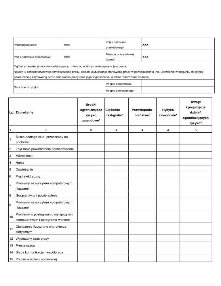 Imię i nazwisko Przedsiębiorstwo: XXX Imię i nazwisko pracownika: XXX XXX przełożonego: Miejsce pracy zdalnej XXX (adres) Ogólna charakterystyka stanowiska pracy i miejsca, w którym wykonywana jest praca: Należy tu scharakteryzować pomieszczenie pracy, opisać usytuowanie stanowiska pracy w pomieszczeniu (np. ustawienie w stosunku do okna), powierzchnię zajmowaną przez stanowisko pracy oraz jego wyposażenie, a także realizowane zadania. Podpis pracownika: Data oceny ryzyka: Podpis przełożonego: Uwagi Środki ograniczające Ciężkość Lp. Zagrożenie ryzyko następstw2 Prawdopodo- Ryzyko bieństwo3 zawodowe4 zawodowe1 1 1 2 Śliska podłoga i/lub przeszkody na podłodze 2 Zbyt mała powierzchnia pomieszczenia 3 Mikroklimat 4 Hałas 5 Oświetlenie 6 Prąd elektryczny 7 8 9 10 11 Problemy ze sprzętem komputerowym i łączami Gorące płyny i powierzchnie Problemy ze sprzętem komputerowym i łączami Problemy w posługiwaniu się sprzętem komputerowym i oprogramo-waniem Obciążenie fizyczne o charakterze statycznym 12 Wydłużony czas pracy 13 Presja czasu 14 Słaba komunikacja i współpraca 15 Poczucie izolacji społecznej 3 i propozycje działań ograniczających ryzyko5 4 4 4 5 16 Brak równowagi między życiem prywatnym a zawodowym